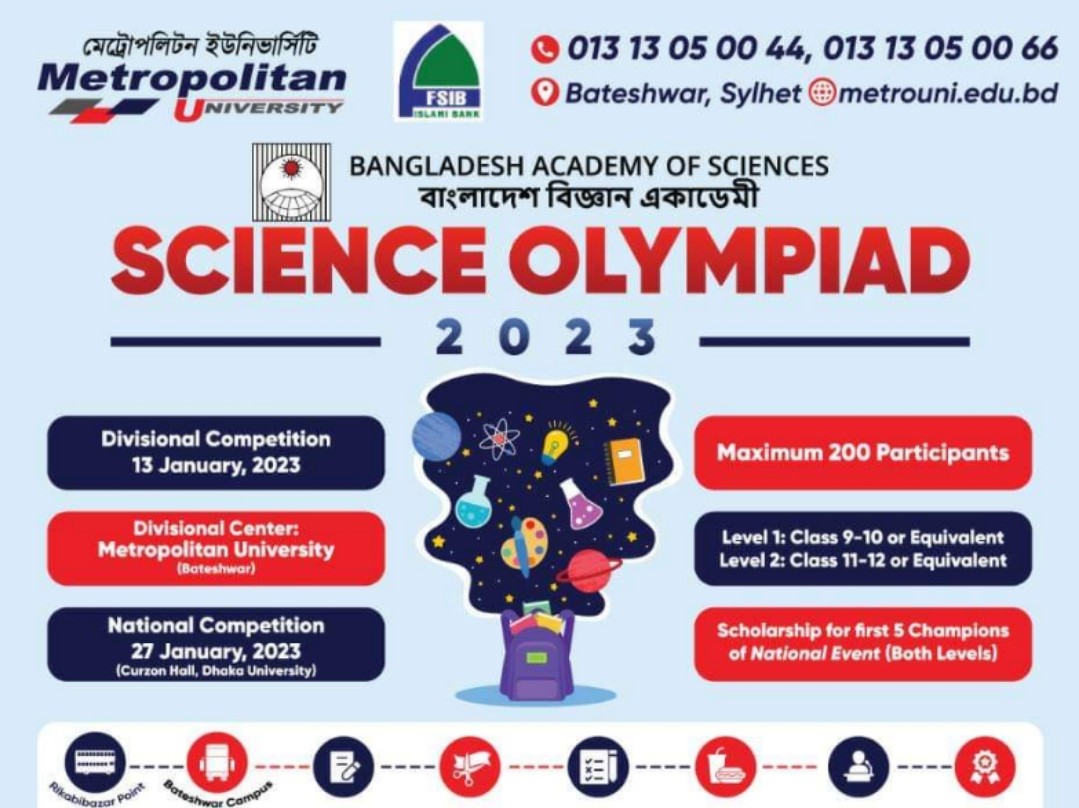 মেট্রোপলিটন ইউনিভার্সিটি সিএসই সোসাইটি ও এসই ইনোভেশন ফোরাম কর্তৃক আয়োজিত এবং বাংলাদেশ বিজ্ঞান একাডেমির তত্বাবধানে অতীতের ন্যায় আগামী শুক্রবার (১৩ জানুয়ারি) বিশ্ববিদ্যালয়ের বটেশ্বরস্থ স্থায়ী ক্যাম্পাসে বিভাগীয় বিজ্ঞান অলিম্পিয়াড -২০২৩ অনুষ্ঠিত হবে। প্রতিযোগিতায় মাধ্যমিক ও উচ্চ মাধ্যমিক শ্রেণিতে সিলেট বিভাগের প্রায় ৬০টি শিক্ষা প্রতিষ্ঠানের মোট ২০০ শিক্ষার্থী অংশগ্রহণ করবে। বিজ্ঞান অলিম্পিয়াডের পৃষ্টপোষক হিসেবে রয়েছে ফাস্ট সিকিউরিটি ইসলামি ব্যাংক লিমিটেড।