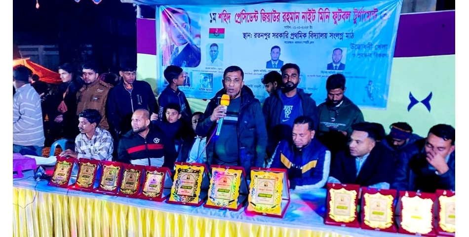 বালাগঞ্জ উপজেলার দেওয়ানবাজার ইউনিয়নের রতনপুরে আয়োজিত ‘প্রথম শহীদ প্রেসিডেন্ট জিয়াউর রহমান নাইট ফুটবল টুর্ণামেন্ট – ২০২৫’ এর শুভ উদ্বোধন অনুষ্ঠিত হয়েছে। বুধবার (১ জানুয়ারি) রাত ৯টায় রতনপুর সরকারি প্রাথমিক বিদ্যালয় সংলগ্ন মাঠে টুর্নামেন্টটির আনুষ্ঠানিক উদ্বোধন করা হয়।