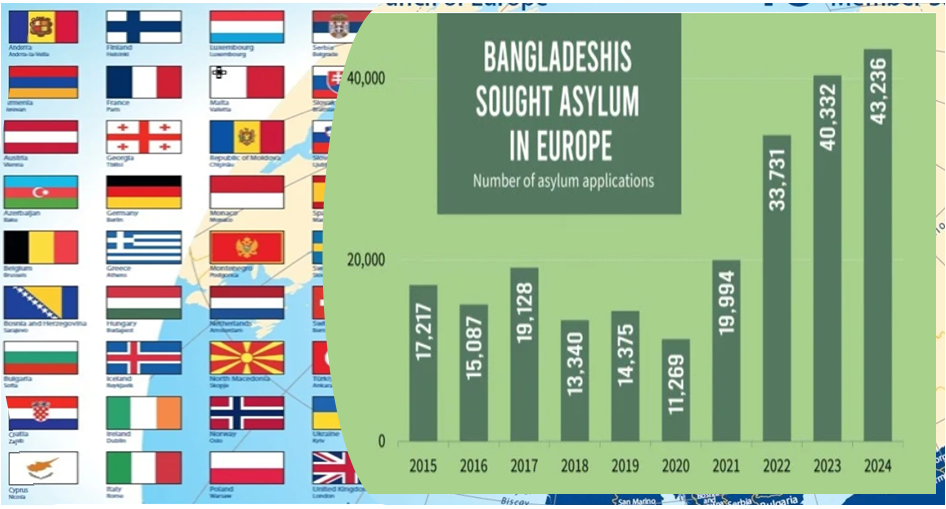 পরিসংখ্যান অনুযায়ী, ২০২৪ সালে ইইউ প্লাস দেশগুলোতে প্রায় ৪৩ হাজার ২৩৬ বাংলাদেশি নাগরিক আশ্রয় চেয়ে আবেদন জমা দিয়েছেন। যা ওই অঞ্চলে একক কোনও দেশ থেকে সবচেয়ে বেশি সংখ্যক নাগরিকের আশ্রয় চাওয়া দেশগুলোর মধ্যে ষষ্ঠতম।