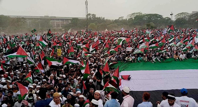 রাজধানীর সোহরাওয়ার্দী উদ্যানে ফিলিস্তিনিদের প্রতি সংহতি জানিয়ে ‘মার্চ ফর গাজা’ কর্মসূচিতে অংশ নেয় লাখো মানুষ। শনিবার (১২ এপ্রিল) আয়োজিত এই কর্মসূচির খবর প্রকাশ করেছে ইসরায়েলের সংবাদমাধ্যম টাইমস অব ইসরায়েল।