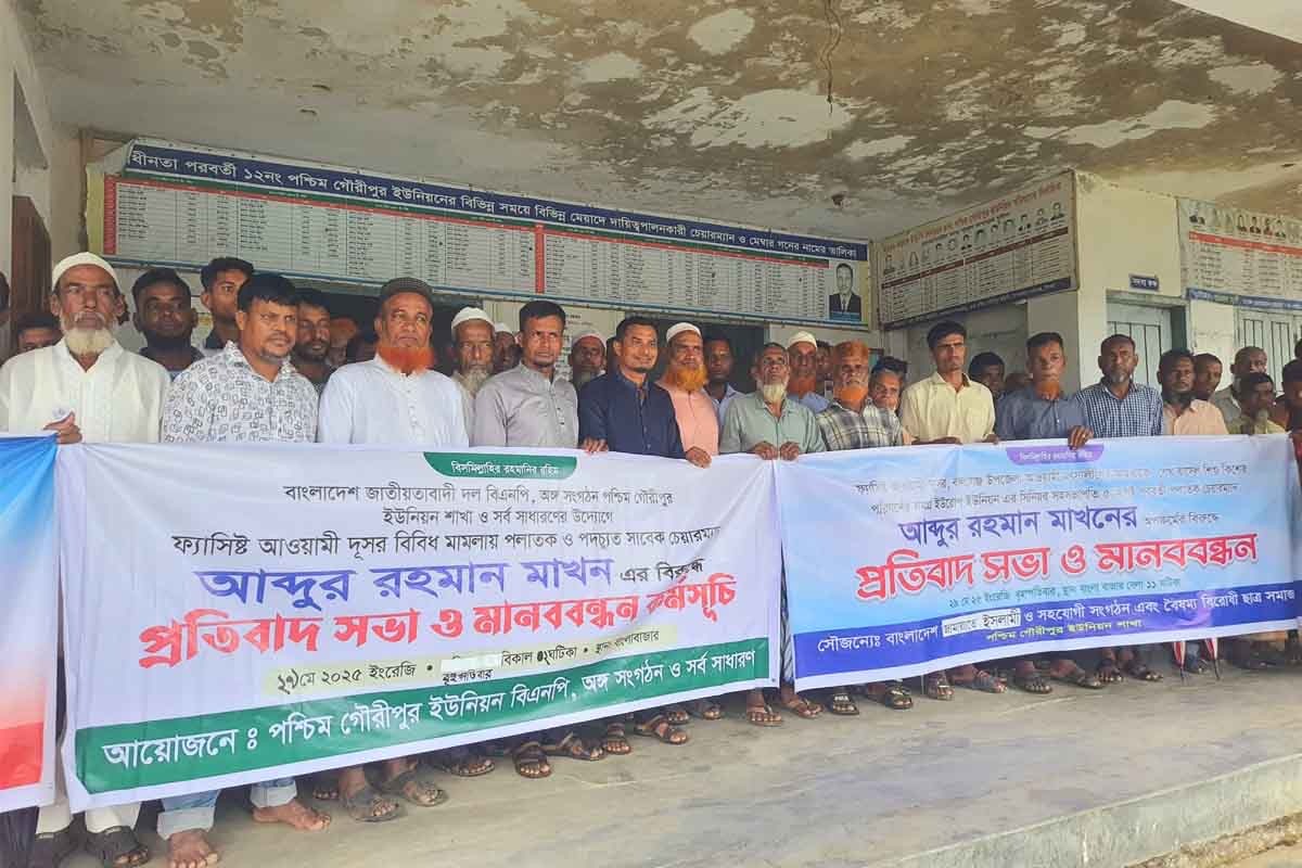 বালাগঞ্জের পশ্চিম গৌরীপুর ইউনিয়ন পরিষদের চেয়ারম্যান আব্দুর রহমান মাখন’র “অপকর্মের বিরুদ্ধে” প্রতিবাদ সভা ও মানববন্ধন অনুষ্ঠিত হয়েছে। আজ বৃহস্পতিবার (২৯ মে) দুপুরে স্থানীয় বাংলাবাজারস্থ ইউনিয়ন পরিষদ কমপ্লেক্সে এ প্রতিবাদ সভা ও মানববন্ধন অনুষ্ঠিত হয়। পশ্চিম গৌরীপুর ইউনিয়ন বিএনপি, জামায়াতে ইসলামী, বৈষম্য বিরোধী ছাত্রসমাজ এবং ভুক্তভোগী সর্বসাধারণের উদ্যোগে এ প্রতিবাদ ও মানববন্ধন চলাকালে প্রধান অতিথি হিসেবে বক্তৃতা করেন বালাগঞ্জ উপজেলা বিএনপির সিনিয়র সহ-সভাপতি ও পশ্চিম গৌরীপুর ইউনিয়ন পরিষদের সাবেক চেয়ারম্যান লুৎফুর রহমান।সভাপতিত্ব করেন বালাগঞ্জ উপজেলা বিএনপির উপদেষ্টা আজম আলী।