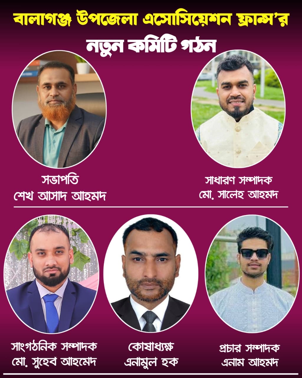 ফ্রান্সে বসবাসরত বালাগঞ্জ উপজেলার নাগরিকদের সামাজিক সংগঠন বালাগঞ্জ উপজেলা এসোসিয়েশন ফ্রান্স’র নতুন কমিটি গঠন করা হয়েছে। ২০১৯ সালের ২১ সেপ্টেম্বর প্রতিষ্ঠিত এবং ফ্রান্স সরকার কর্তৃক রেজিস্ট্রেশনপ্রাপ্ত (নং-N° W932010930) এ সংগঠনের নতুন কমিটি গঠন উপলক্ষে গত মঙ্গলবার (১৬ সেপ্টেম্বর) এক সাধারণ সভা অনুষ্ঠিত হয়। অনুষ্ঠিত সভায় গঠিত কমিটির কর্মকর্তারা হলেন, সভাপতি শেখ আসাদ আহমদ, সিনিয়র সহ-সভাপতি ইউসুফ আলী, সহ-সভাপতি সালমান আহমেদ, সহ-সভাপতি সুহেল আহমেদ, সহ-সভাপতি মির্জা শফিকুর রহমান, সহ-সভাপতি আতাউর রহমান তালুকদার, সহ-সভাপতি আক্তার হোসেন, সহ-সভাপতি সাজ্জাদ আহমেদ, সহ-সভাপতি খালেদ আহমদ, সহ-সভাপতি জাহাংগীর আলম, সাধারণ সম্পাদক ছালেহ আহমদ, সিনিয়র সহ সাধারণ সম্পাদক ইয়াছিন আলী তালুকদার, সহ-সাধারণ সম্পাদক আব্দুল মজিদ, সহ-সাধারণ সম্পাদক এম.এম.মাছুম, সহ সাধারণ সম্পাদক শেখ জাবের আহমদ, সহ সাধারণ সম্পাদক মির্জা সুজন, সহ-সাধারণ সম্পাদক আব্দুল জলিল, সহ-সাধারণ সম্পাদক স্বপন দাস, সহ-সাধারণ সম্পাদক আব্দুল মালিক, সাংগঠনিক সম্পাদক সুয়েব আহমেদ স্বপন, সহ-সাংগঠনিক ফয়েজ আহমেদ, সহ-সাংগঠনিক ফজরুল আমীন, সহ-সাংগঠনিক মির্জা জায়েদ, সহ-সাংগঠনিক রুমন আহমেদ, সহ-সাংগঠনিক কাওছার আহমেদ, সহ-সাংগঠনিক মাহবুব তালুকদার, সহ-সাংগঠনিক হাসান আহমেদ, সহ সাংগঠনিক সম্পাদক সাকিব আহমদ সিদ্দিকী, কোষাধ্যক্ষ এনামুল হক, সহ-কোষাধ্যক্ষ শাহ আলম, প্রচার সম্পাদক এনাম আহমেদ, সহ-প্রচার সম্পাদক আক্তার আহমেদ, দপ্তর সম্পাদক জাহাঙ্গীর আলম স্বপন, সহ-দপ্তর সম্পাদক সাইফ আহমেদ, সহ-দপ্তর সম্পাদক মো: রুবেল মিয়া, ক্রীড়া বিষয়ক সম্পাদক ফরহাদ আহমদ, সহ-ক্রীড়া বিষয়ক সম্পাদক সালমান আহমেদ, সহ-ক্রীড়া সম্পাদক শেখ আল-মাহমুদ সামি, আন্তর্জাতিক বিষয়ক সম্পাদক আলামিন হোসেন, সহ-আন্তর্জাতিক বিষয়ক সম্পাদক খয়রুল ইসলাম রুবেল, সহ-আন্তর্জাতিক বিষয়ক সম্পাদক রুবেল আহমেদ, সহ-আন্তর্জাতিক বিষয়ক সম্পাদক আক্তার আহমদ, ধর্ম বিষয়ক সম্পাদক জাকারীয়া শাকিল, সনাতন ধর্ম বিষয়ক সম্পাদক বিশ্বজিৎ দাশ, সমাজ কল্যাণ সম্পাদক এম আর জিলা, সহ-সমাজ কল্যাণ সম্পাদক ফয়জুর রহমান রানা, সহ-সমাজ কল্যাণ সম্পাদক তালুকদার সাইদুর মুন্না, শিক্ষা ও পাঠ বিষয়ক সম্পাদক মাহবুব শিকদার, সহ-শিক্ষা ও পাঠ বিষয়ক সম্পাদক রাজন চৌধুরী, আইন বিষয়ক সম্পাদক মুস্তাক বেগ, সাংস্কৃতিক বিষয়ক সম্পাদক শেখ জুনেদ, সহ-সাংস্কৃতিক বিষয়ক সম্পাদক মাসুদ আহমেদ, শ্রমিক কল্যাণ সম্পাদক সুলতান আহমদ, সহ-শ্রমিক কল্যাণ সম্পাদক শিপন আহমদ, অনলাইন বিষয়য়ক সম্পাদক শেখ রাইয়ান আহমদ আসুক, সহ-অনলাইন বিষয়ক সম্পাদক সালেহ আহমদ।