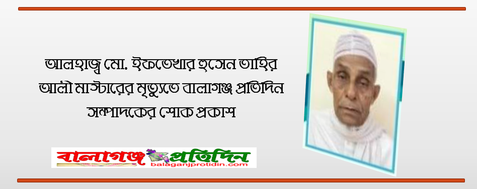 প্রবীণ মুরব্বি, শিক্ষানুরাগী ও সমাজসেবক, মাদার বাজার এফ. ইউ. হাফিজিয়া ফাজিল ডিগ্রি মাদ্রাসার সভাপতি, লেখক ও সালিশ ব্যক্তিত্ব আলহাজ্ব মো. ইফতেখার হুসেন তাহির আলী মাস্টারের মৃত্যুতে গভীর শোক ও দুঃখ প্রকাশ করেছেন বালাগঞ্জ প্রতিদিনের প্রধান সম্পাদক মুহাম্মাদ শরীফুজ্জামান।